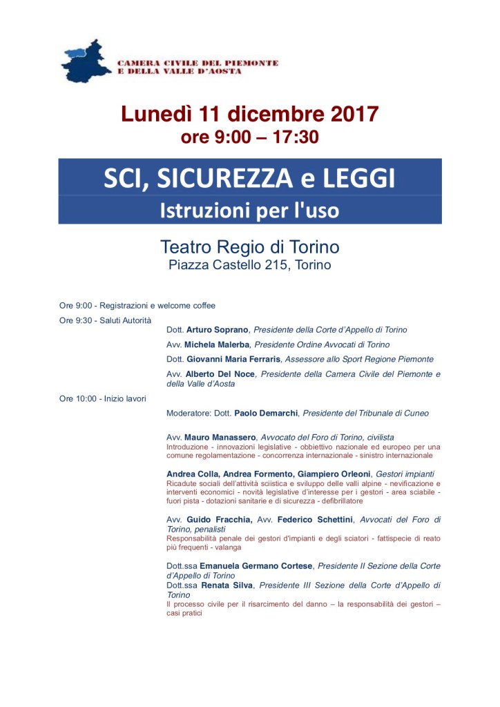Nel 2017 è stato relatore al Convegno “Sci Sicurezza e Leggi” organizzato dalla commissione scientifica presso il Consiglio dell’Ordine degli Avvocati di Torino, evento accreditato per la formazione professionale presso la Scuola Superiore della Magistratura e l’Ordine degli Avvocati di Torino; con il patrocinio della Regione Piemonte e con il sostegno della Unione Industriale di Torino e dell’A.R.P.I.E.T. .